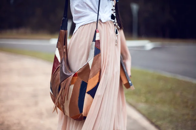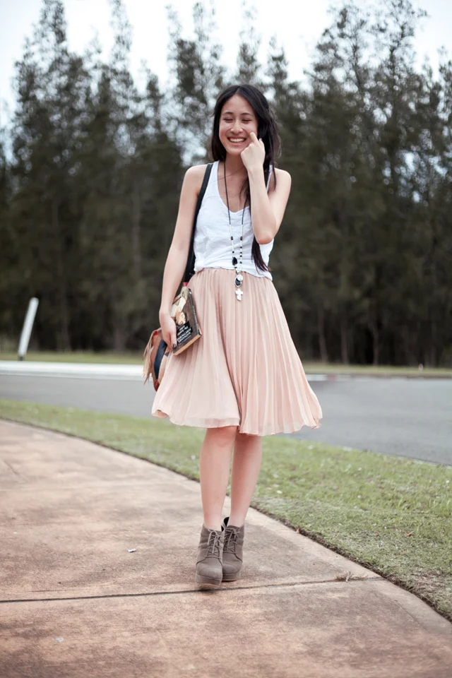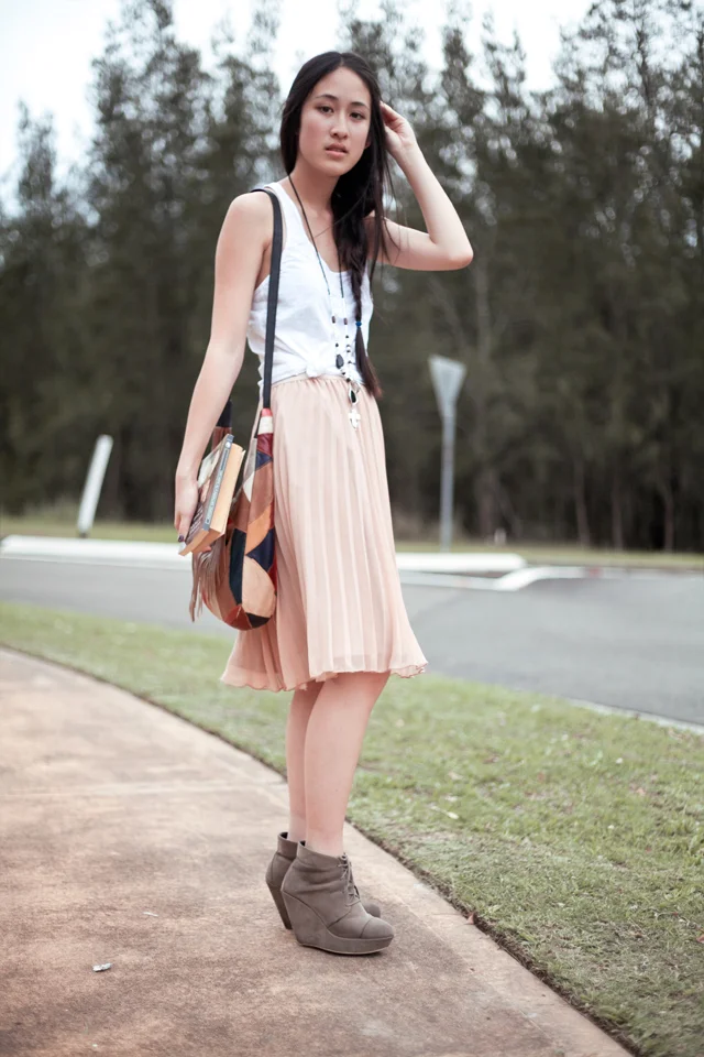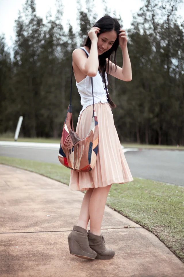 White singlet (Cotton On) / Pleated mid-length skirt (a random brandless store) / Tasseled patchwork bag & cross necklace with beads (Sportsgirl) / Grey/brown wedges (Betts)