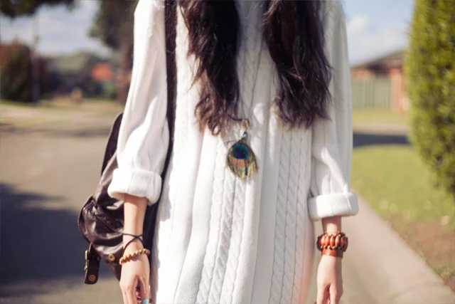 I am in my usual colours of tan/white/black today, but my nails added a pop of colour to the outfit. My peacock feather necklace (psst... it's actually an earring I hooked onto a gold chain) adds some subtle colours too.