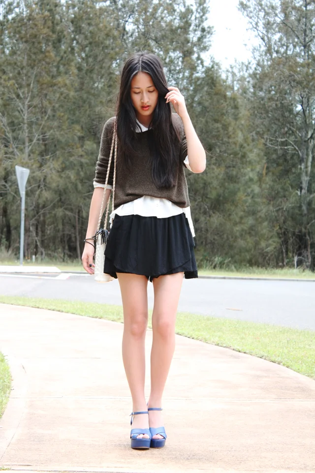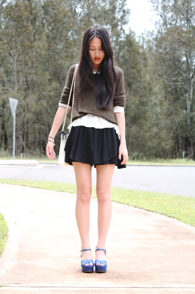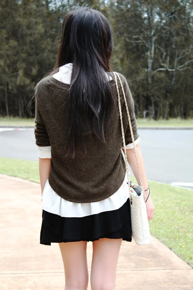 I feel like I'm back at high school in this outfit (except my school skirts were always up to my knees) because of the jumper over the blouse. When I walked out of my room this morning, even my mum questioned why I looked semi-respectable. I'll admit, I was pretty excited to see grey skies when I woke up because I've really missed layering. The asymmetrical and frilly hems that I layered today made a simple combination much more interesting.