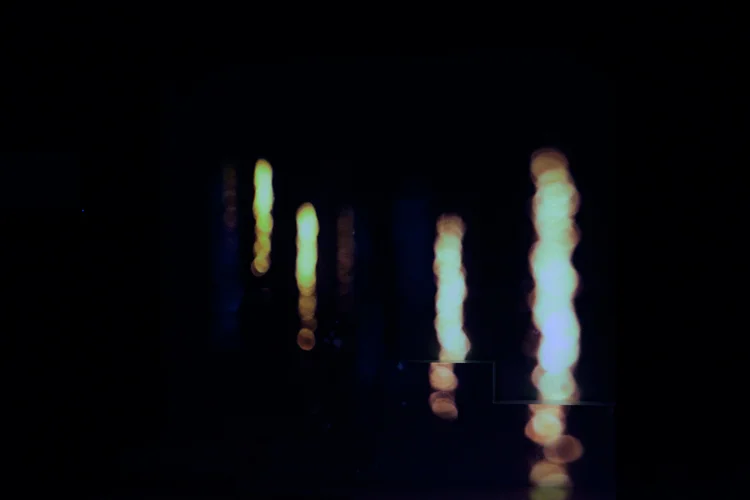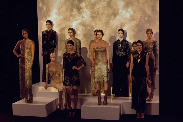 Haunting music and flickering of projected images on the dresses strangely reminded me of driving in the city at night where headlights of cars passing by lit up streets and night wanderers. In those first few minutes of the presentation, glimpses of the models were all we could see, and the wild lights caused some confusion and frustration among media and photographers.