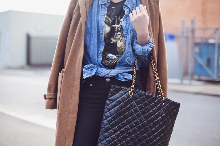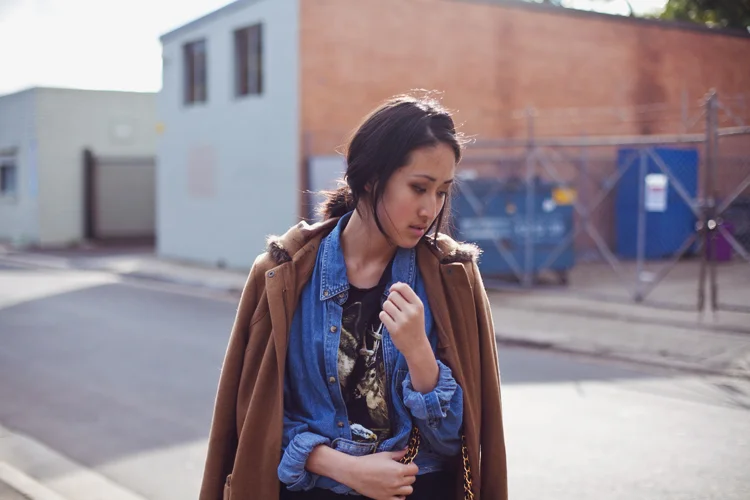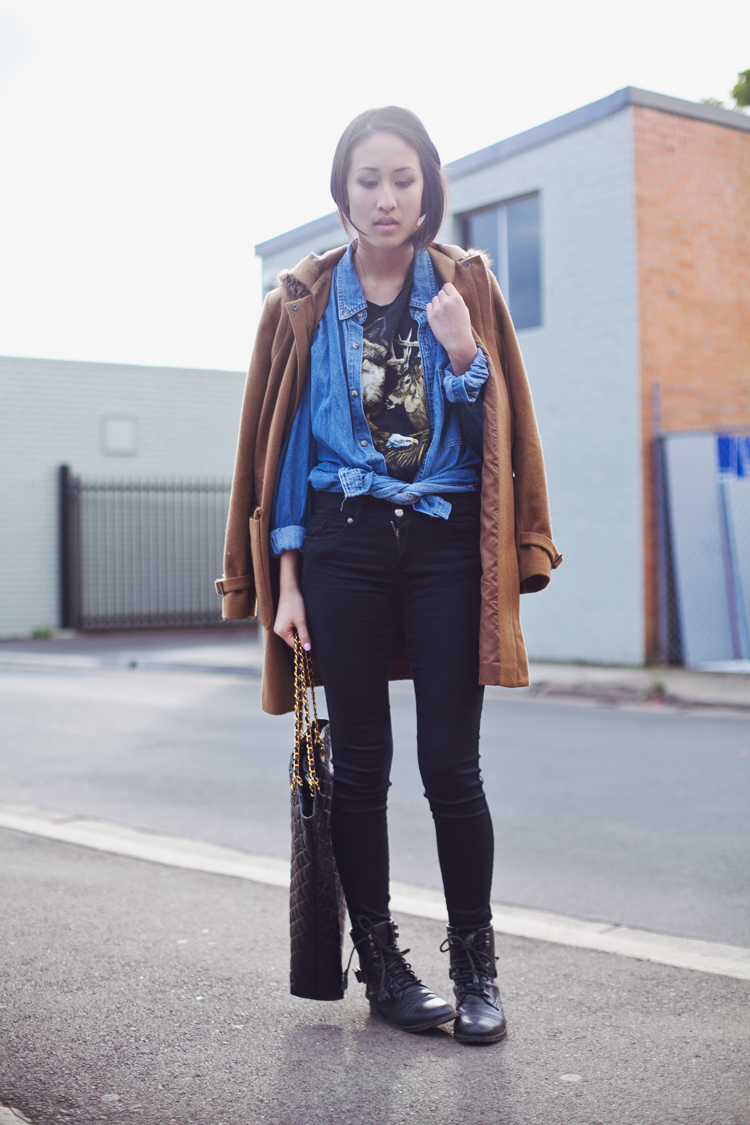 ASOS coat, Miss Brown Vintage denim shirt and top, Refuge jeans, Brandless bag, Target boots