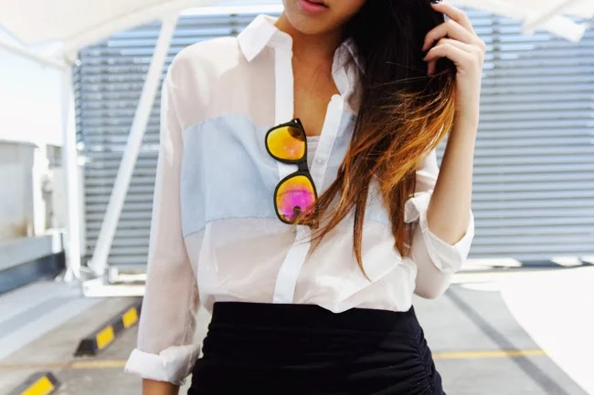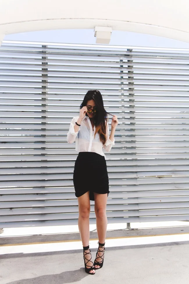 Anna Quan'Taj' shirt, Stylestalker skirt, Spurr 'Klass' heels, Kevin's sunglasses